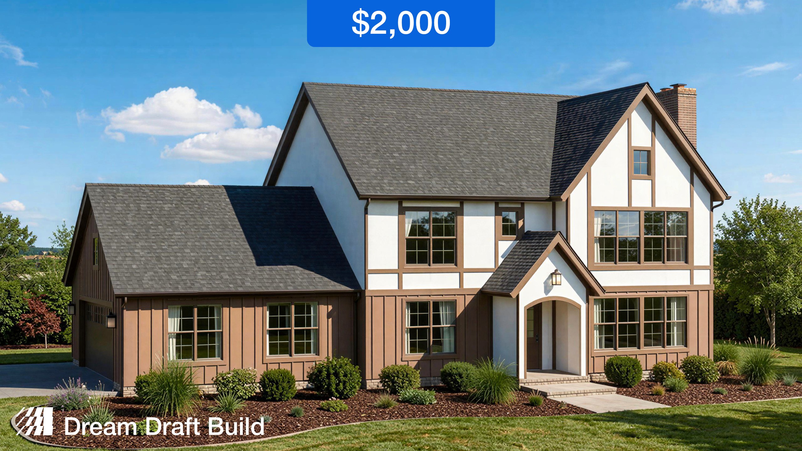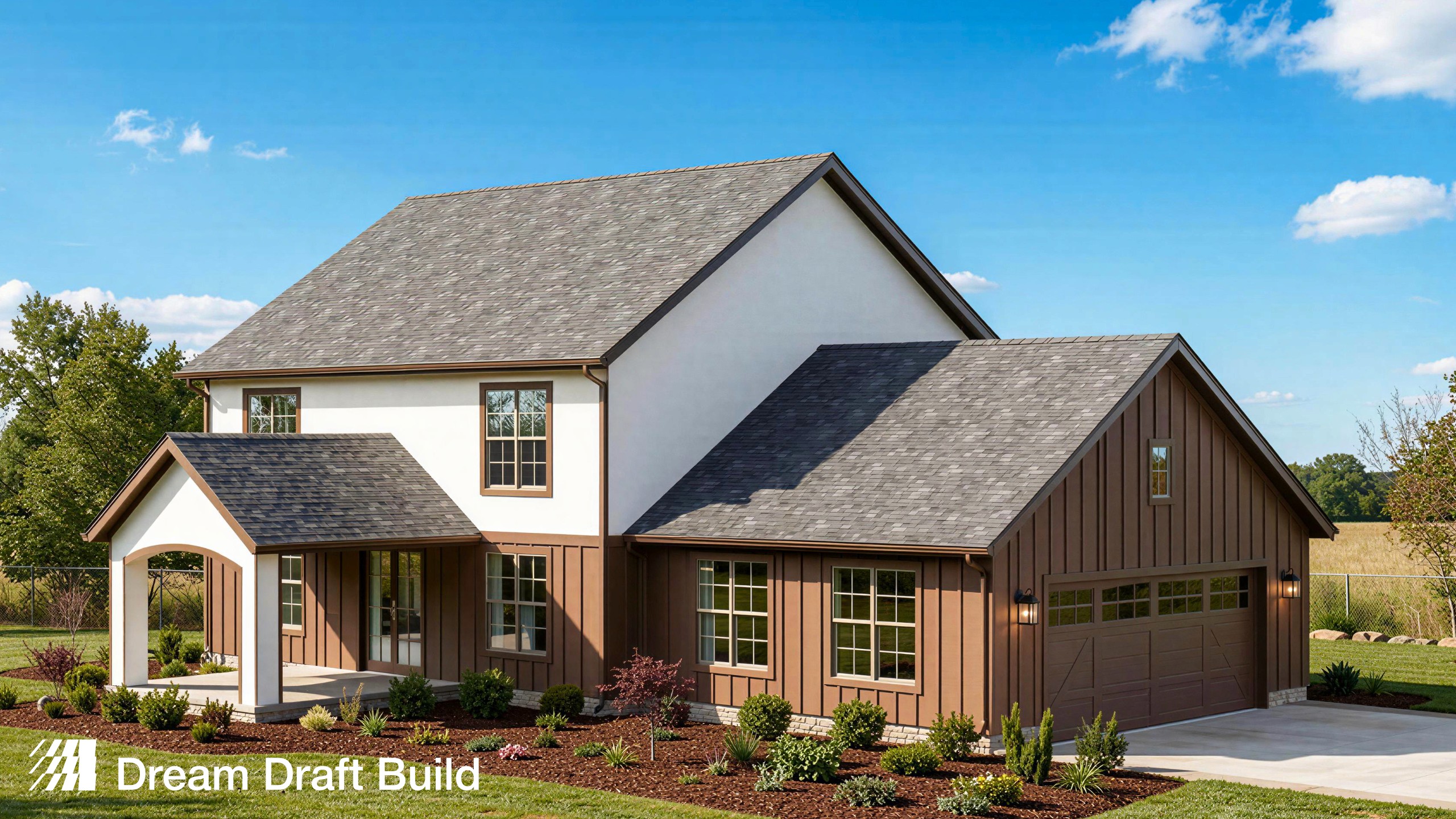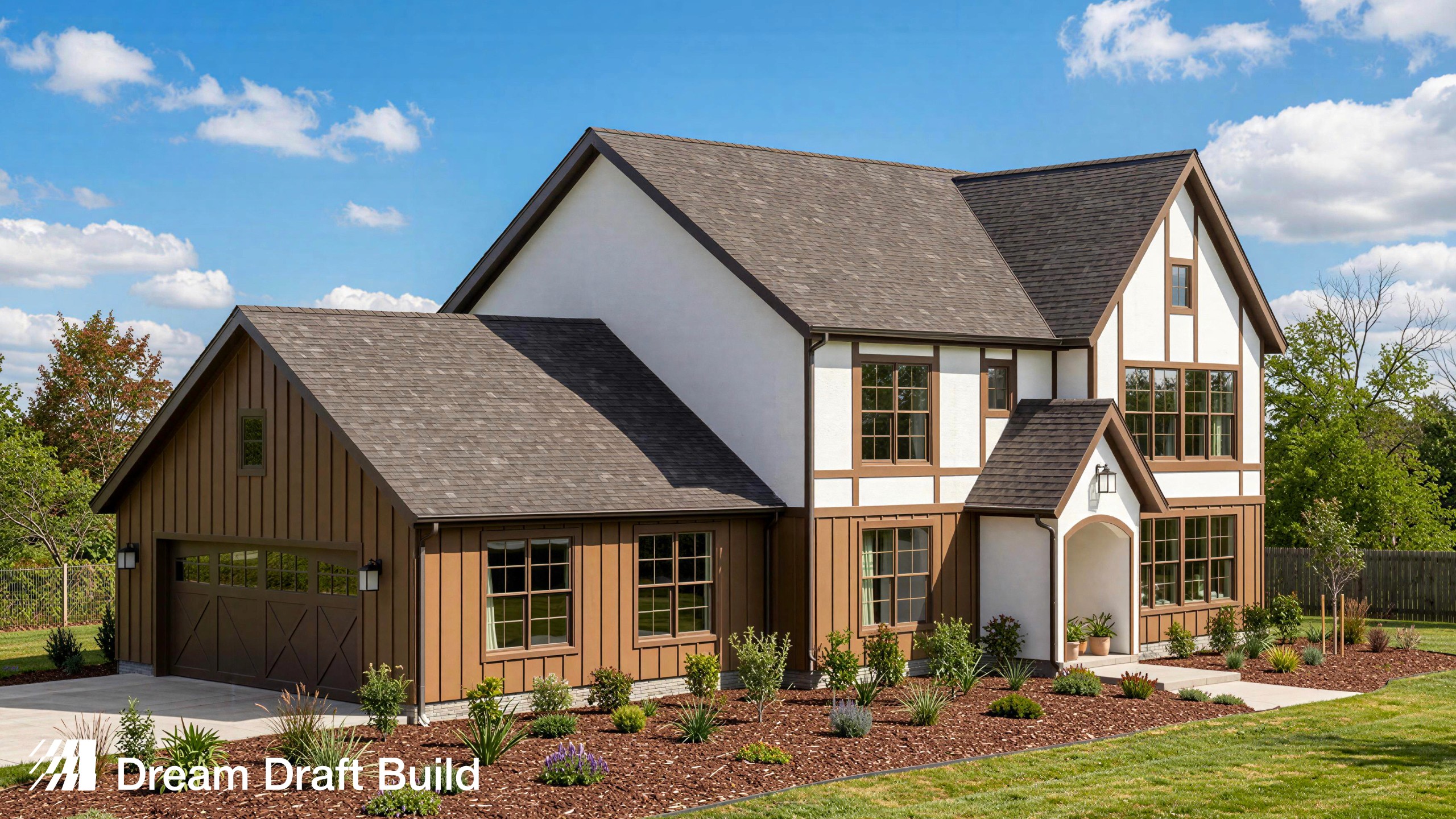 A traditional home featuring a practical layout with a simple, cozy shape, highlighted by front facing gables and functional design elements.